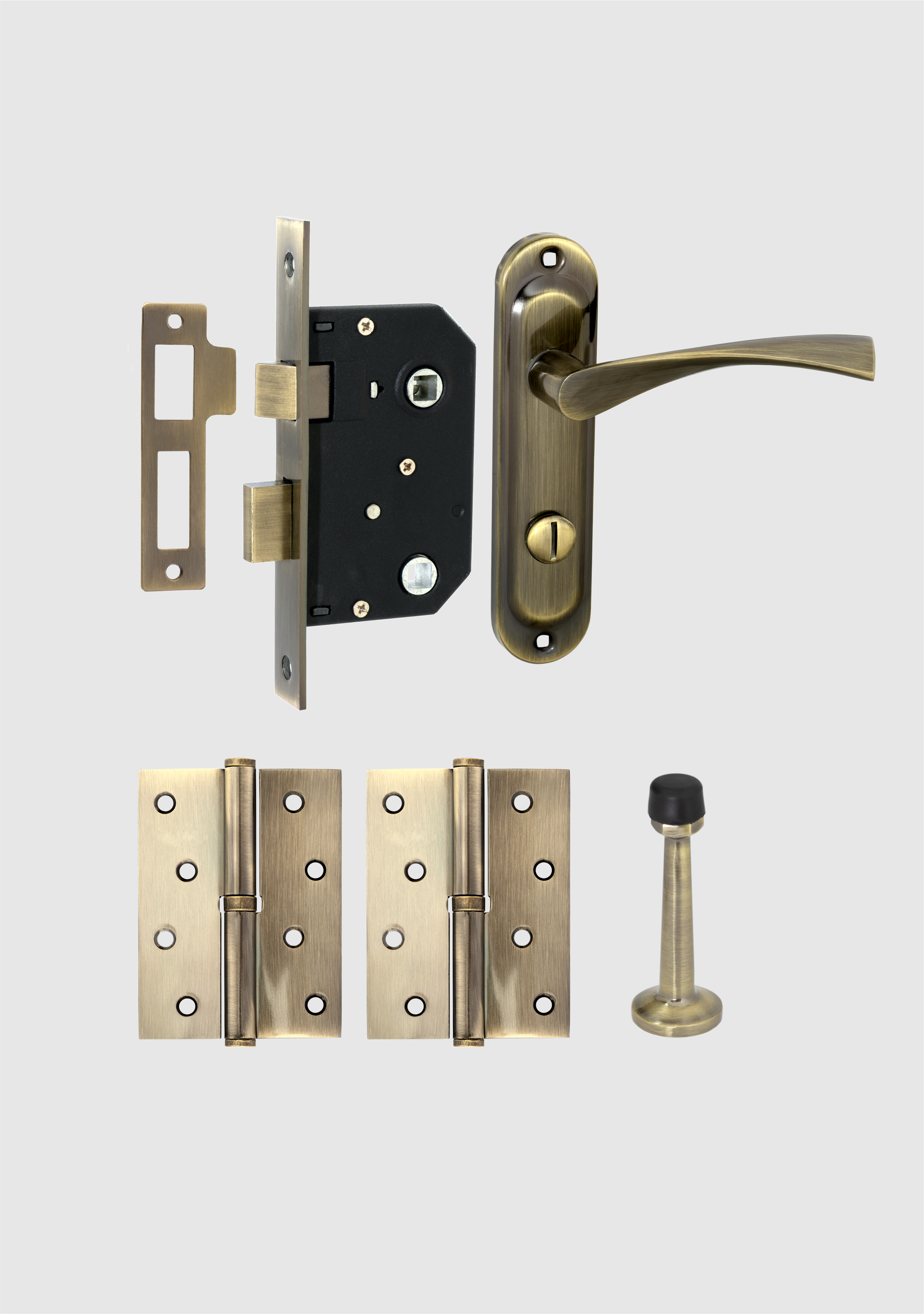 Если вы сомневаетесь и не знаете что именно вам необходимо для полной комплектации сантехнической двери, то мы вам подскажем. В стандартный комплект дверной фурнитуры входит: ручка дверная на планке, замок врезной для межкомнатных дверей, пара петель и дверной упор.